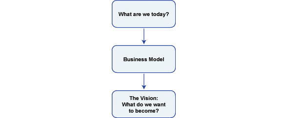 - The Vision box (What we want to become), however, is very different. We do get to dream it up! It can be virtually anything the CEO and Board want it to be and needs to include a list of the factors required to achieve it. Deciding what to put into the Vision box will likely be an iterative process. Given the company we are today, we can try many different Visions and develop a Business Model to get us from where we are to each Vision. Then we repeat the process with different Visions until we bring our dreams into reasonable balance with practical reality (Ah, you knew there was a catch!), until we're satisfied with the result.